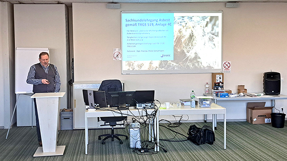 Bereits am ersten Seminartag wurde deutlich, wie viel Erfahrung und Didaktik Peter Schürmann in seine Schulungen einbringt. Die Teilnehmenden setzten sich intensiv mit den verschiedenen Arten, Eigenschaften und Einsatzgebieten von Asbest, den gesundheitlichen Risiken, den rechtlichen Grundlagen sowie den konkreten Schutzmaßnahmen auseinander. Auch die neuesten Anforderungen der TRGS 519 (Stand Februar 2025) wurden ausführlich erklärt und anhand realer Praxisbeispiele verdeutlicht.
